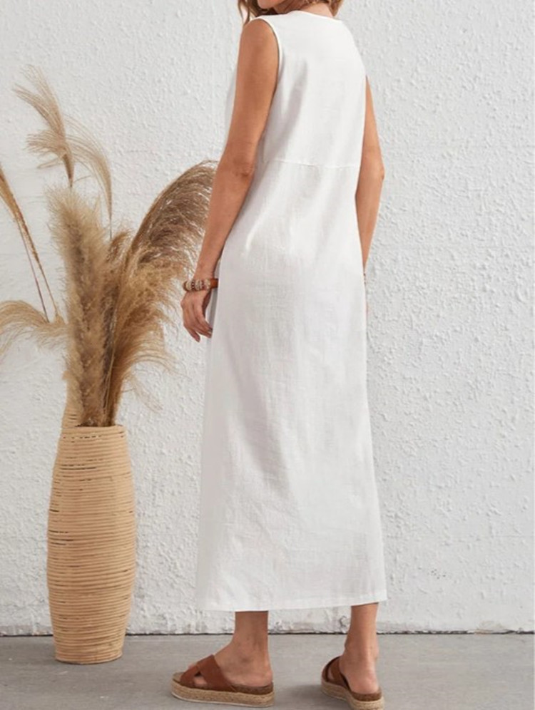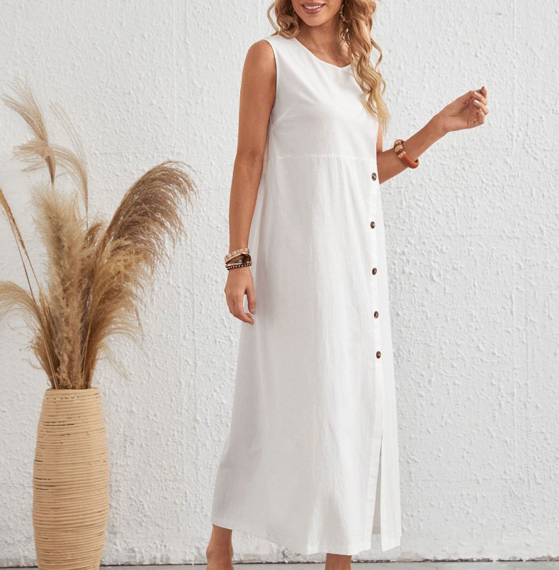 Elegant Cotton Linen Dress with Fastener Decoration and Long Slit